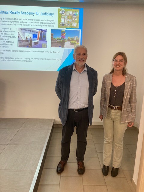 La première journée était consacrée à la présentation et à la démonstration de la plateforme VR-DIGIJUST, développée par Agenfor International. Son directeur, Sergio Bianchi, a exposé les risques liés à l’intelligence artificielle et l’importance de diffuser des informations vérifiées. Conçue comme un environnement de type jeu vidéo, la plateforme permet d’évoluer dans des bâtiments numériques — accueil, bibliothèque, salles de cours, tribunal, jusqu’à la Cour européenne des droits de l’homme. La bibliothèque rassemble des documents juridiques, des présentations et des vidéos dont les sources sont rigoureusement contrôlées, tandis que le tribunal autorise la simulation d’audiences.